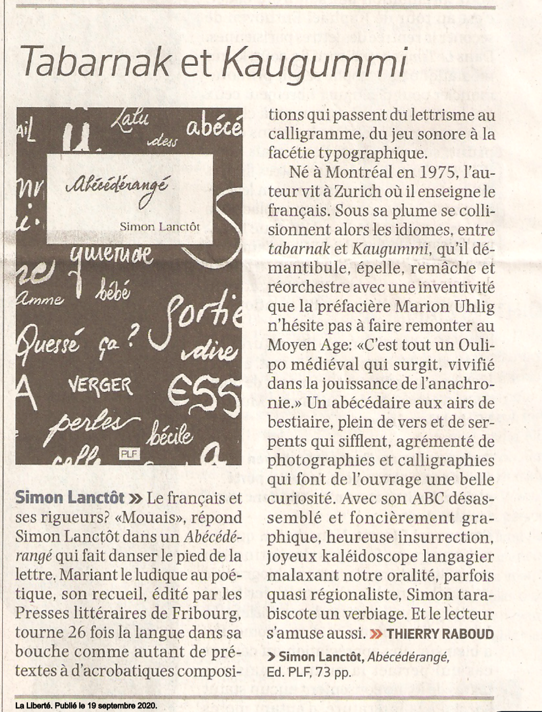dans le journal La Liberté (19 sept. 2020)