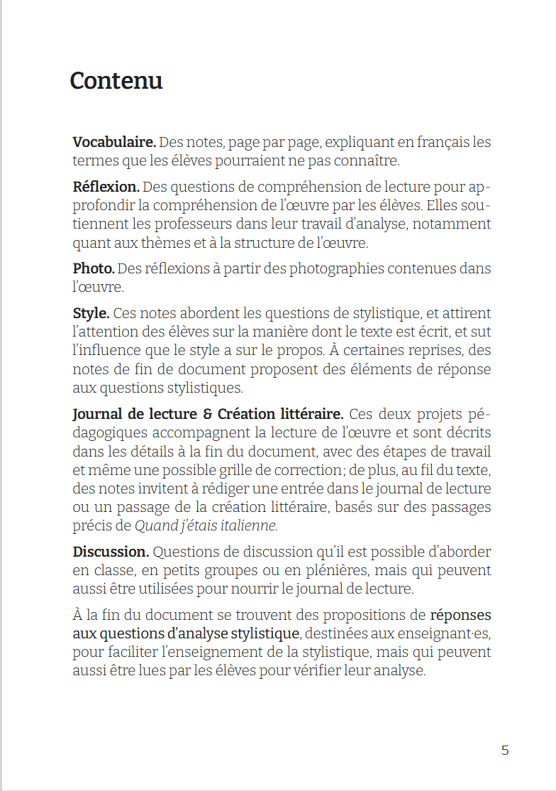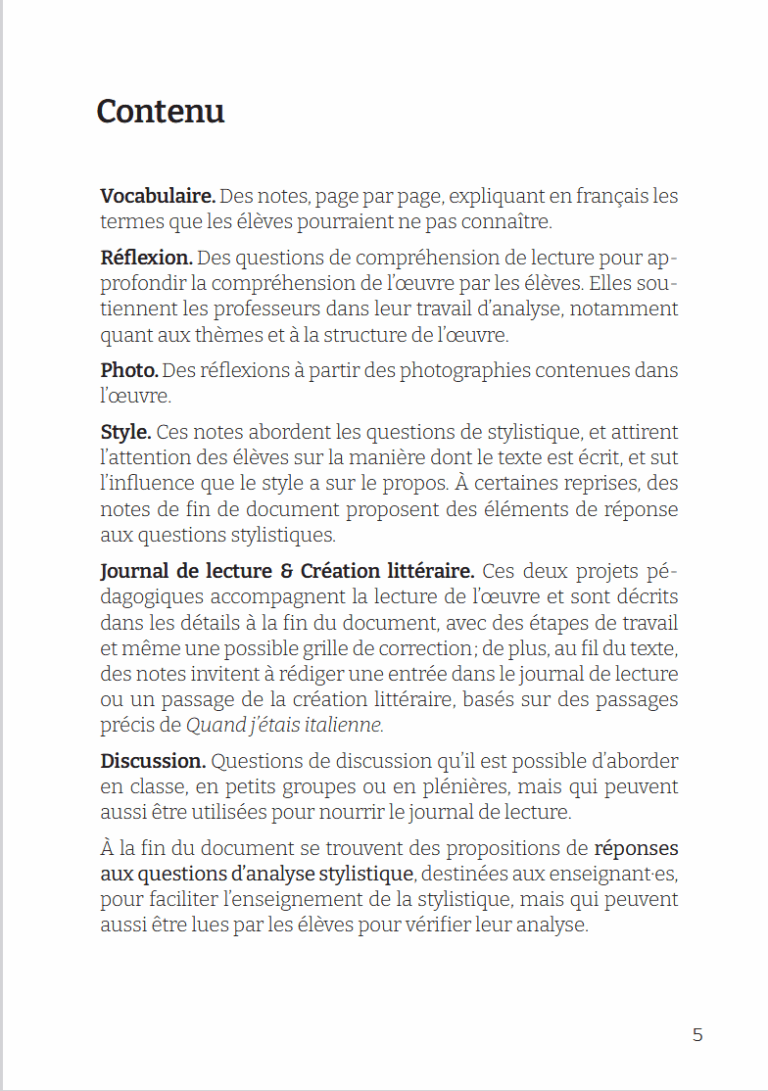 Notes de vocabulaire pour des non-francophones, questions d'analyse et de réflexion, travaux de journal de bord ou de création littéraire: voici un dossier complet pour soutenir professeurs et élèves dans leur lecture et dans l'enseignement du merveilleux texte Quand j'étais italienne, de Sylvie Laliberté (Somme toute, 2013).