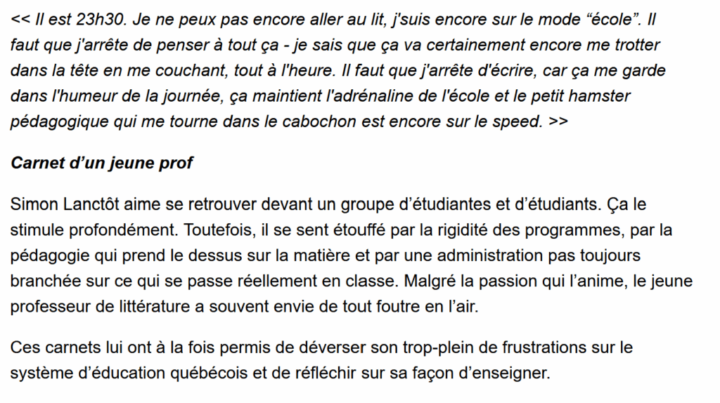 Québec, Septentrion, coll. Hamac Carnets, 2013. 338 pages.