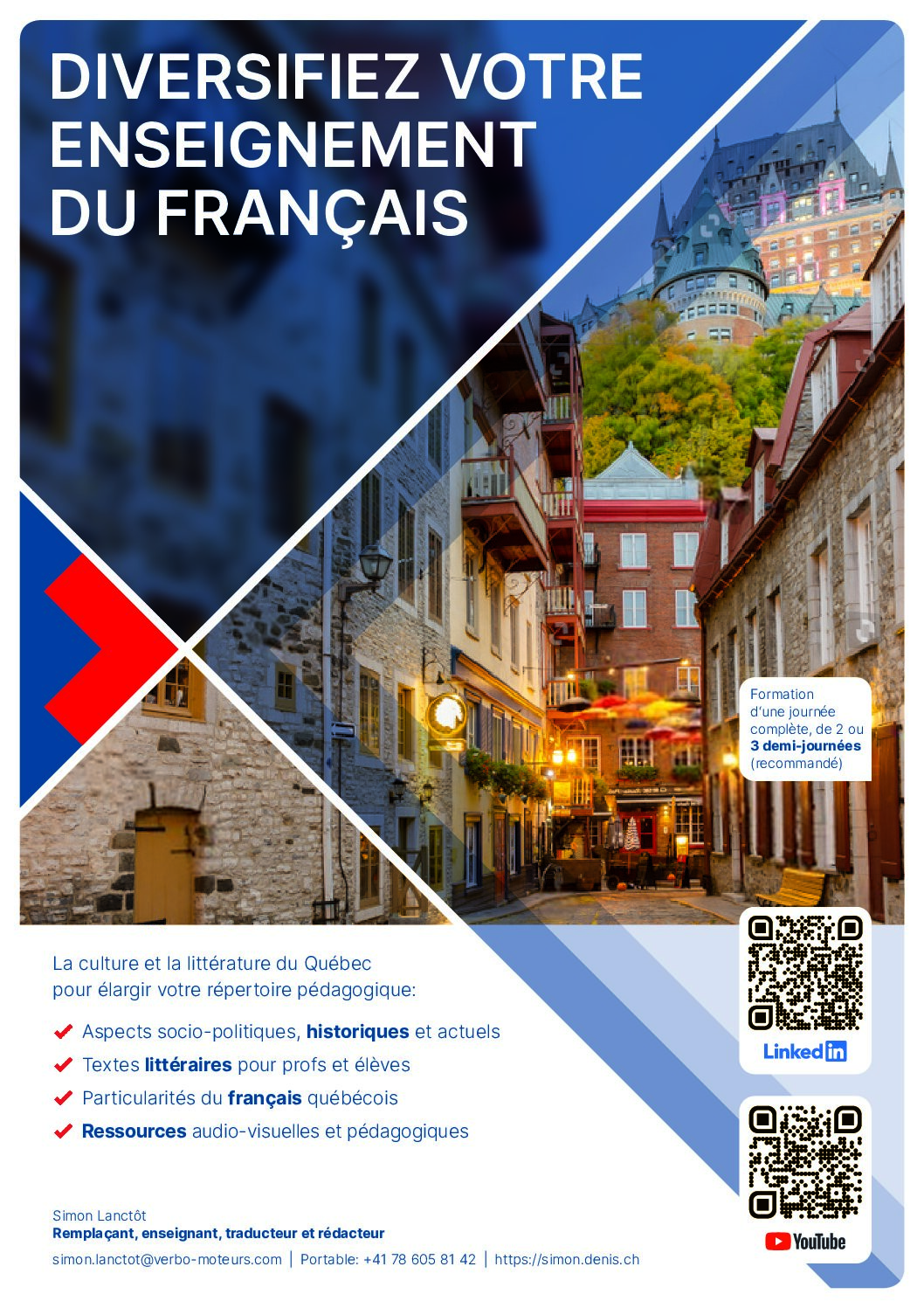 Tout pour intégrer la culture et la littérature du Québec dans vos cours de français! Contexte social et historique du Québec. Particularités du français québécois. Textes littéraires. Ressources audio-visuelles et pédagogiques. Pour les enseignant·es au niveau gymasial.